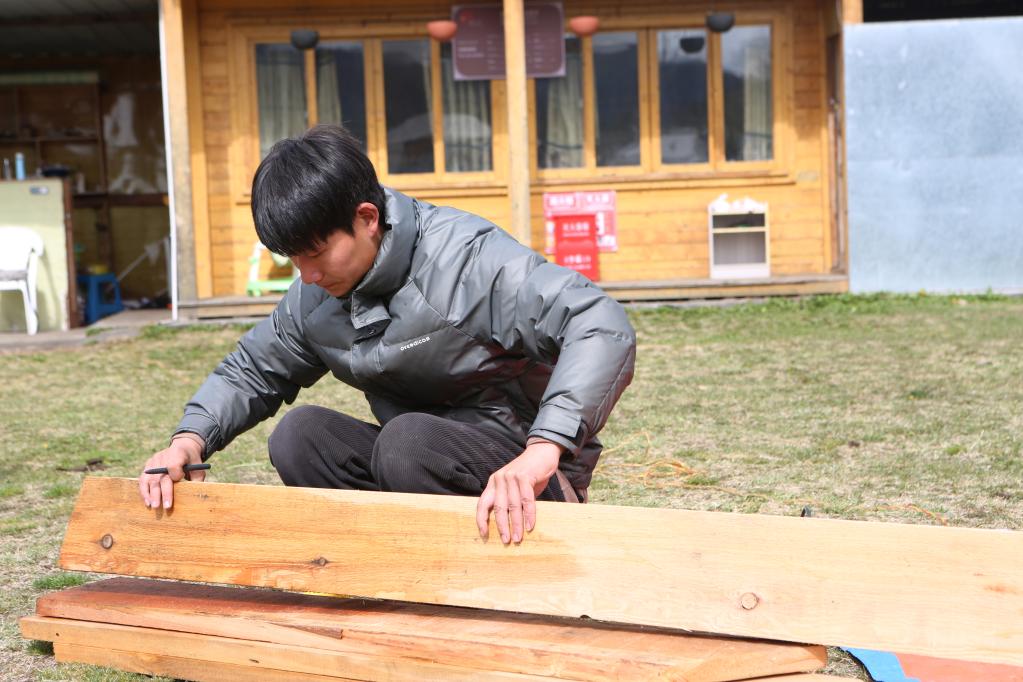 3月23日,白瑪德吉的丈夫殷合在制作民宿桌椅。新華社記者 邵澤東 攝