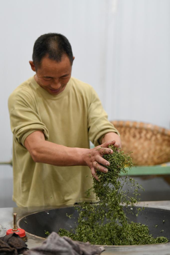 新店鎮茶葉集中加工園區一車(chē)間內,工人在制茶。新華社記者 胥冰潔 攝