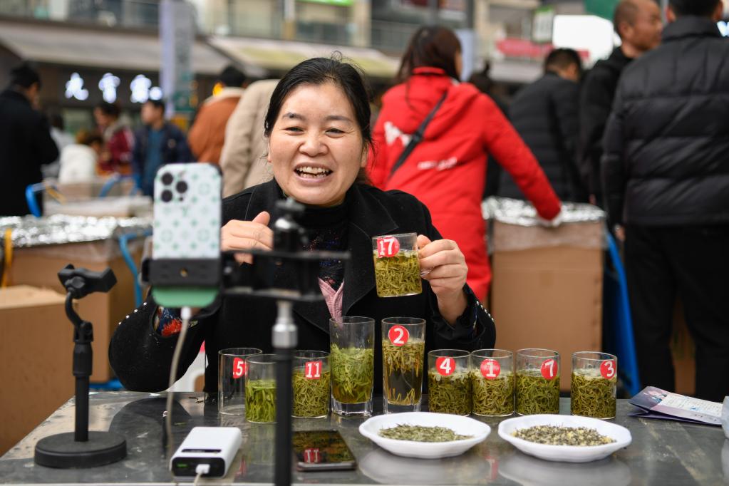 上午9點(diǎn),交易市場(chǎng)的人流量達到了頂峰。茶商們接踵摩肩,詢(xún)價(jià)聲此起彼伏。市場(chǎng)的一隅,一對中年夫妻正用手機進(jìn)行直播帶貨。妻子的面前,10杯蒙頂甘露一字排開(kāi),她繪聲繪色地描述著(zhù)茶葉的特點(diǎn)。這天早上,不到2平方米的臨時(shí)直播攤在短短幾個(gè)多小時(shí)里賣(mài)出了8000多元的蒙山茶。