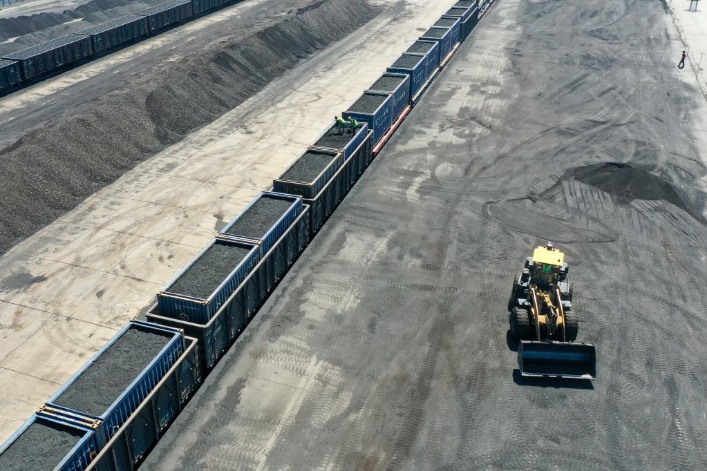 在位于哈密市伊吾縣的淖毛湖站,工作人員正將煤炭裝入火車(chē)(2022年7月26日攝)。新華社記者 丁磊 攝