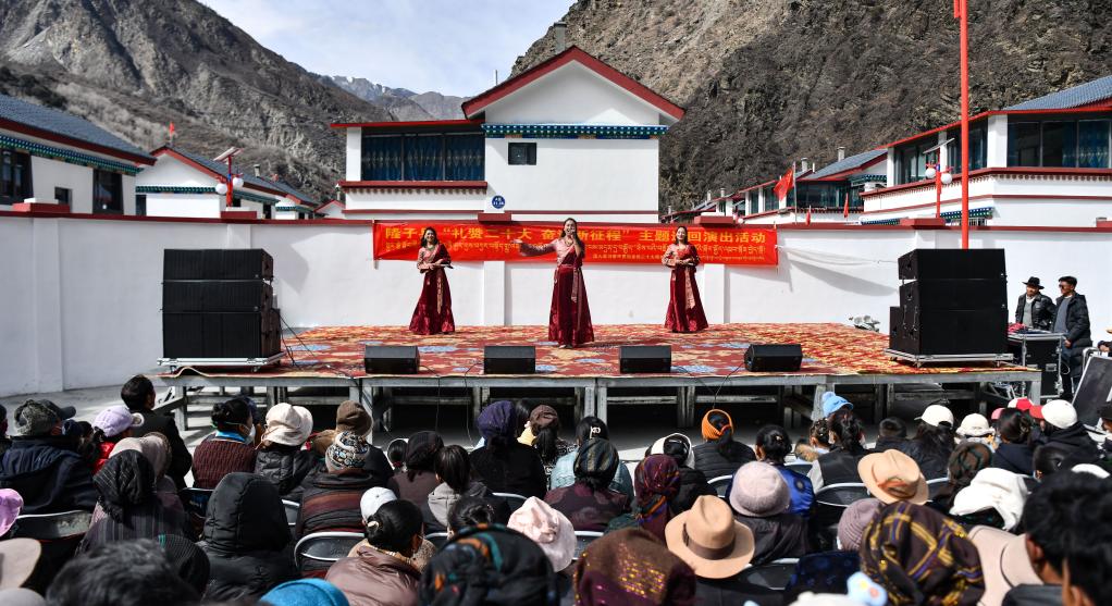 山南市隆子縣藝術(shù)團來(lái)到隆子縣斗玉珞巴民族鄉繞讓搬遷安置點(diǎn)開(kāi)展藏歷新年文藝演出(2月15日攝)。新華社記者晉美多吉 攝