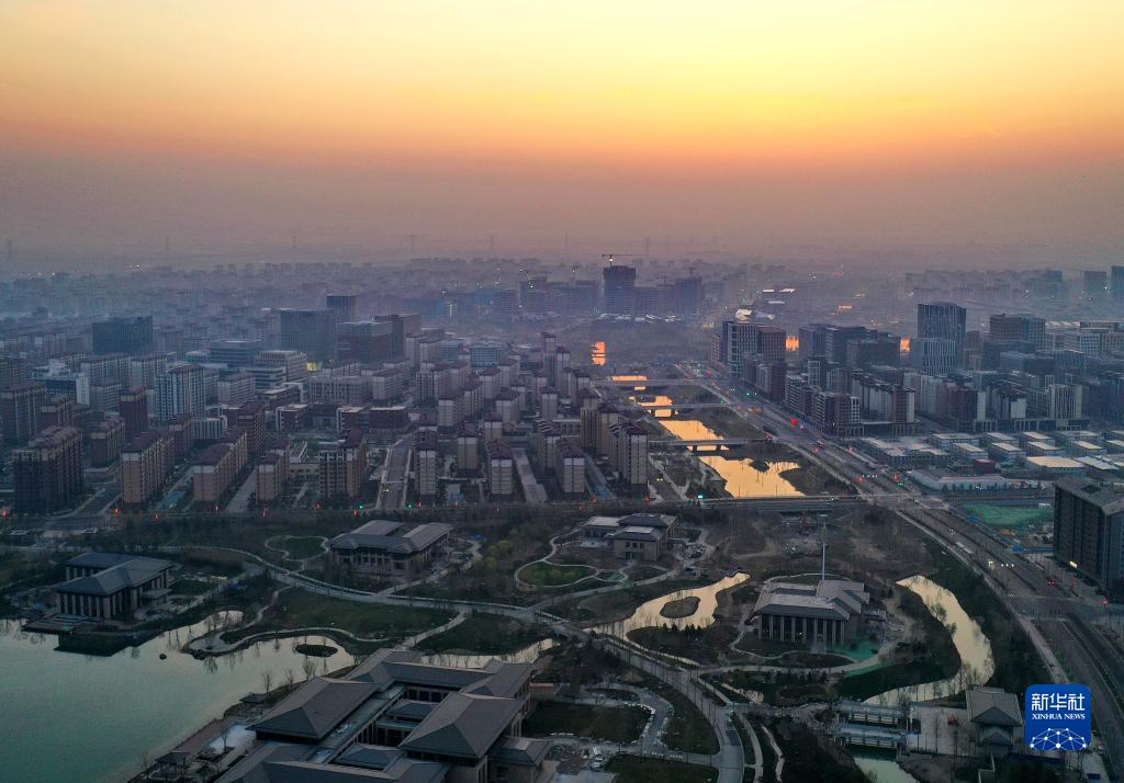 雄安新區容東片區內的水系沐浴在晨光中(2023年3月31日攝,無(wú)人機照片)。新華社記者 牟宇 攝