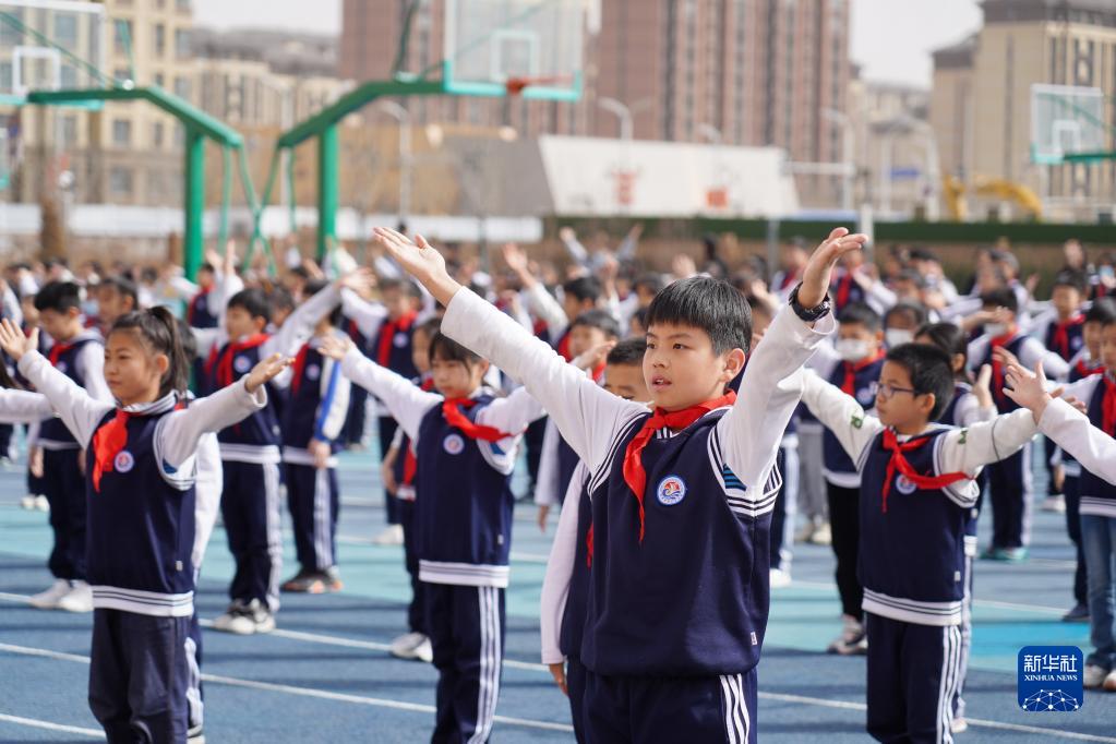 雄安新區容西片區云溪小學(xué)的學(xué)生在操場(chǎng)上做操(2023年3月23日攝)。新華社記者 牟宇 攝
