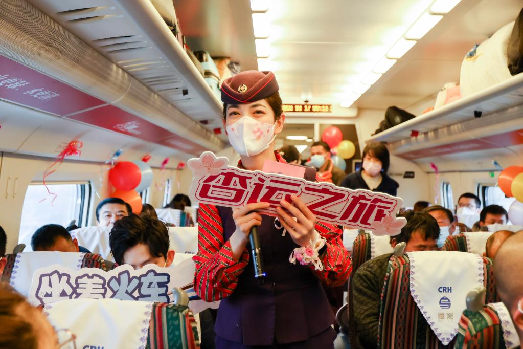 3月17日,列車(chē)員在首趟“杏花號”高鐵列車(chē)車(chē)廂內與乘客進(jìn)行互動(dòng)游戲。新華社記者 郝昭 攝