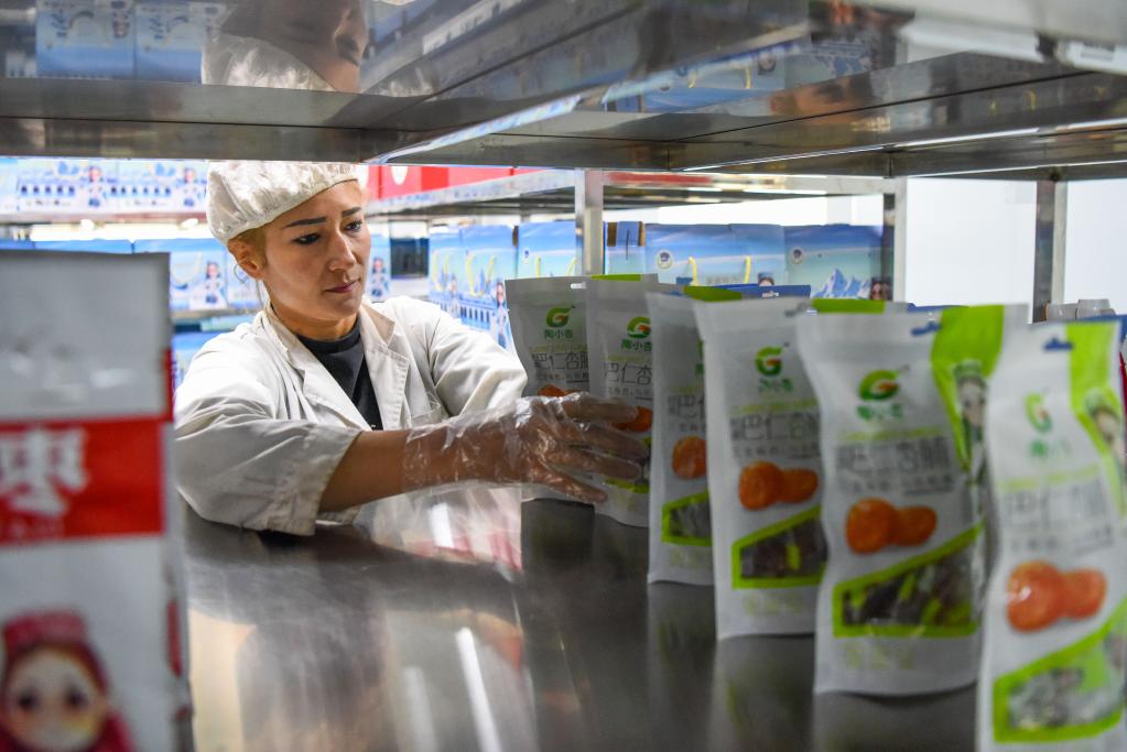 3月27日,在新疆阿克陶縣國投公司的特色農副產(chǎn)品加工車(chē)間,工人為展示柜補貨。新華社記者 丁磊 攝