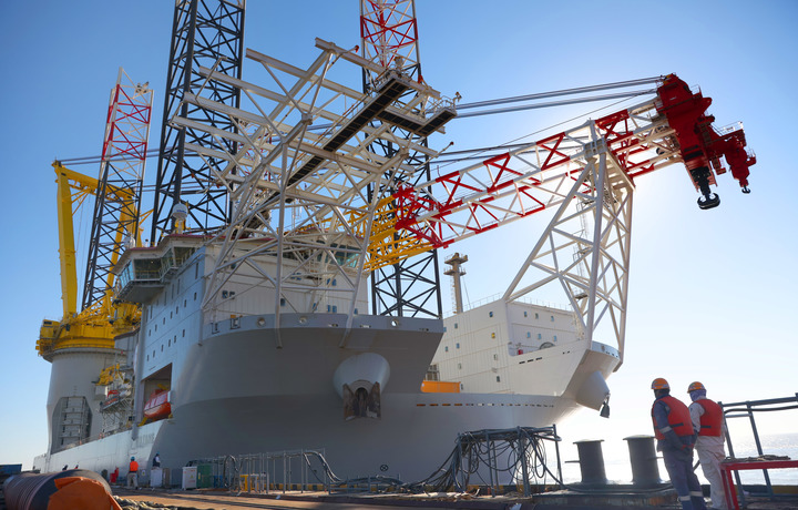 2022年12月20日,由江蘇啟東中遠海運海工為國外客戶(hù)訂制的N966自升式風(fēng)電安裝船交付啟航。新華社發(fā)(許叢軍攝)