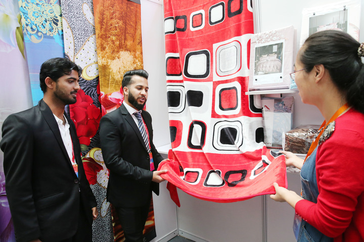 外國客商在“一帶一路”疊石橋進(jìn)出口商品交易會(huì )上查看中國家紡產(chǎn)品。(資料照片,許叢軍攝)