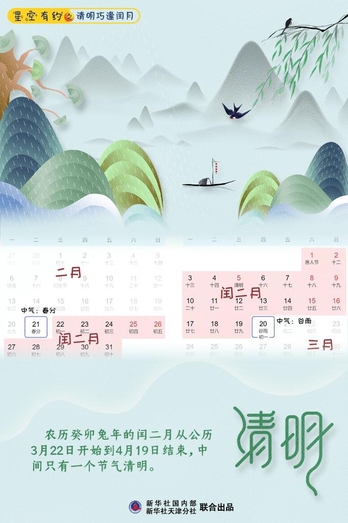 農歷癸卯兔年的閏二月就是今年二月的閏月。這個(gè)閏二月從公歷3月22日開(kāi)始到4月19日結束,中間只有一個(gè)節氣清明。