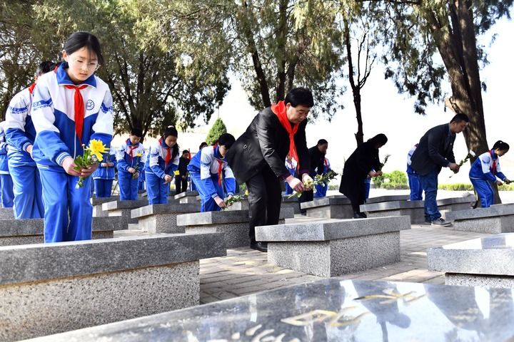 3月29日,在山東省菏澤市魯西新區張和莊烈士陵園,張景憲(前排左二)和劉廟小學(xué)的師生為無(wú)名烈士獻花。新華社記者 郭緒雷 攝