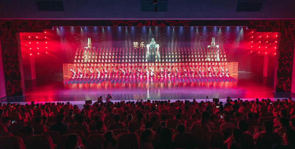 游客在方特東方神畫(huà)主題樂(lè )園里觀(guān)看《楚樂(lè )》表演。(周俊飛 攝)
