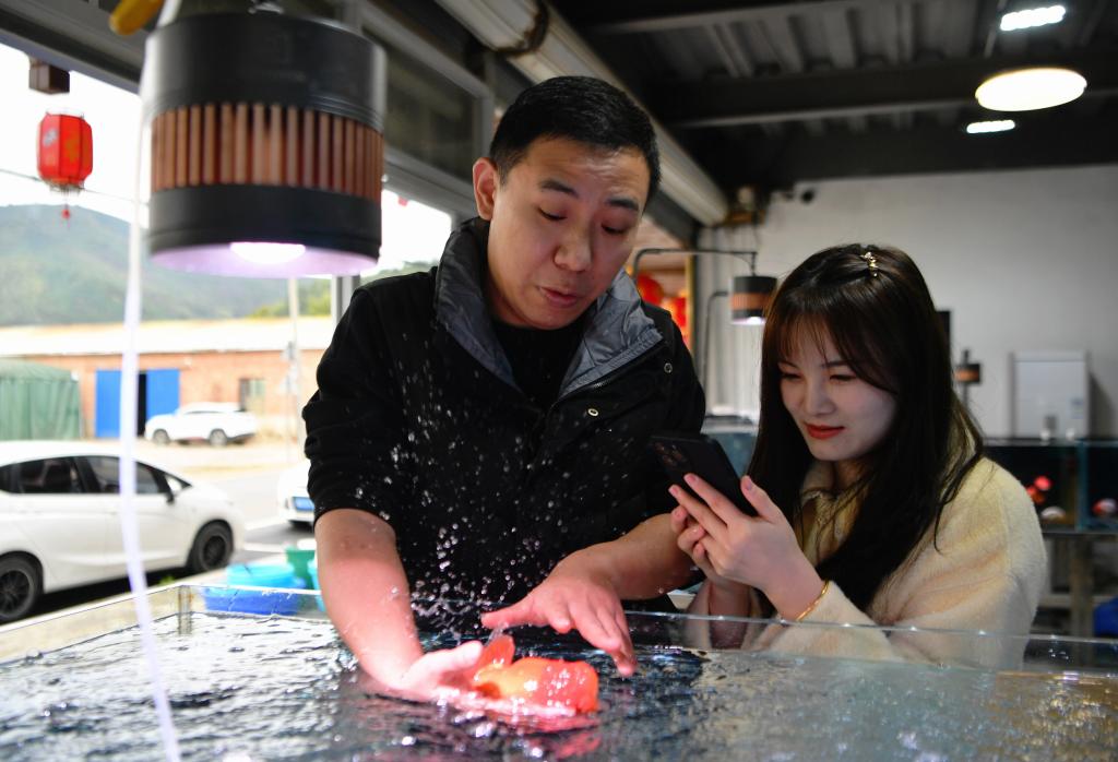陳杰(左)和助手通過(guò)電商平臺直播銷(xiāo)售金魚(yú)。( 2月14日攝)。新華社記者魏培全 攝