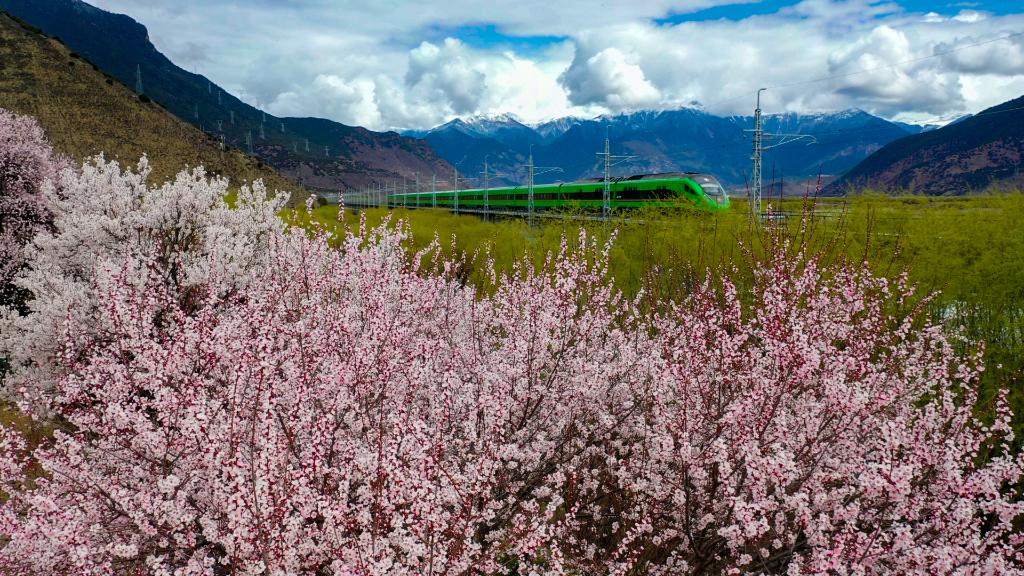 復興號列車(chē)行駛在兩側桃花盛開(kāi)的拉林鐵路上(無(wú)人機照片,3月25日攝)。新華社記者姜帆 攝