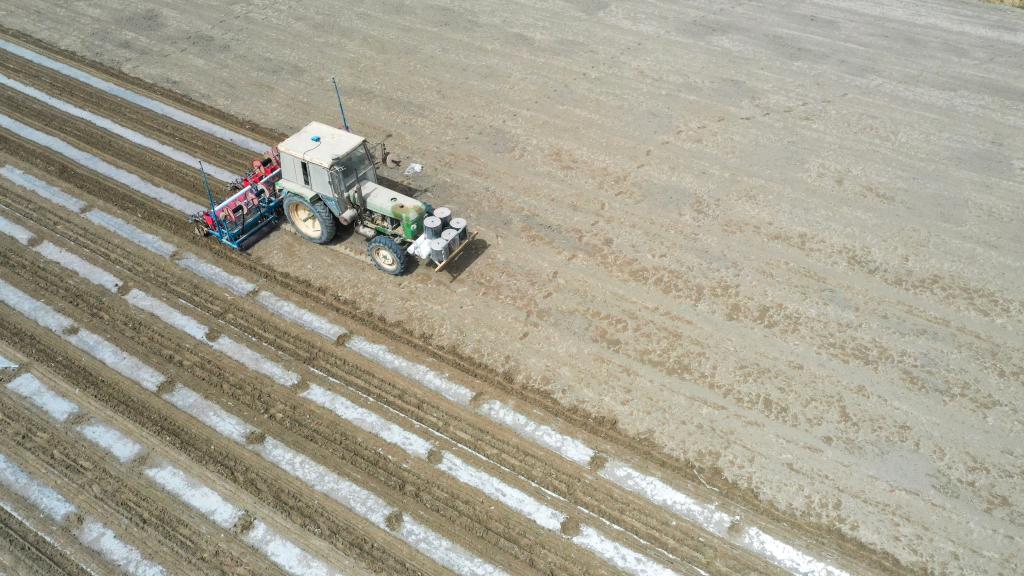 爾肯·熱衣木正在進(jìn)行棉花春播(4月17日,無(wú)人機拍攝)。 新華社發(fā) (汪志鵬 攝)
