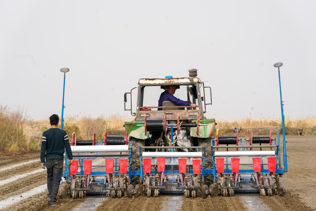 爾肯今年51歲,他播種的棉田位于新疆巴音郭楞蒙古自治州尉犁縣,地處塔克拉瑪干沙漠北緣。這里氣候干燥,光熱充足,是中國優(yōu)質(zhì)商品棉基地,每年棉花種植面積約100萬(wàn)畝。爾肯種植棉花已經(jīng)26年,是一位名副其實(shí)的“老”棉農。從最初的小塊地、小機械,發(fā)展到今年的近400畝,犁地、播種、管理、采收全程機械化。