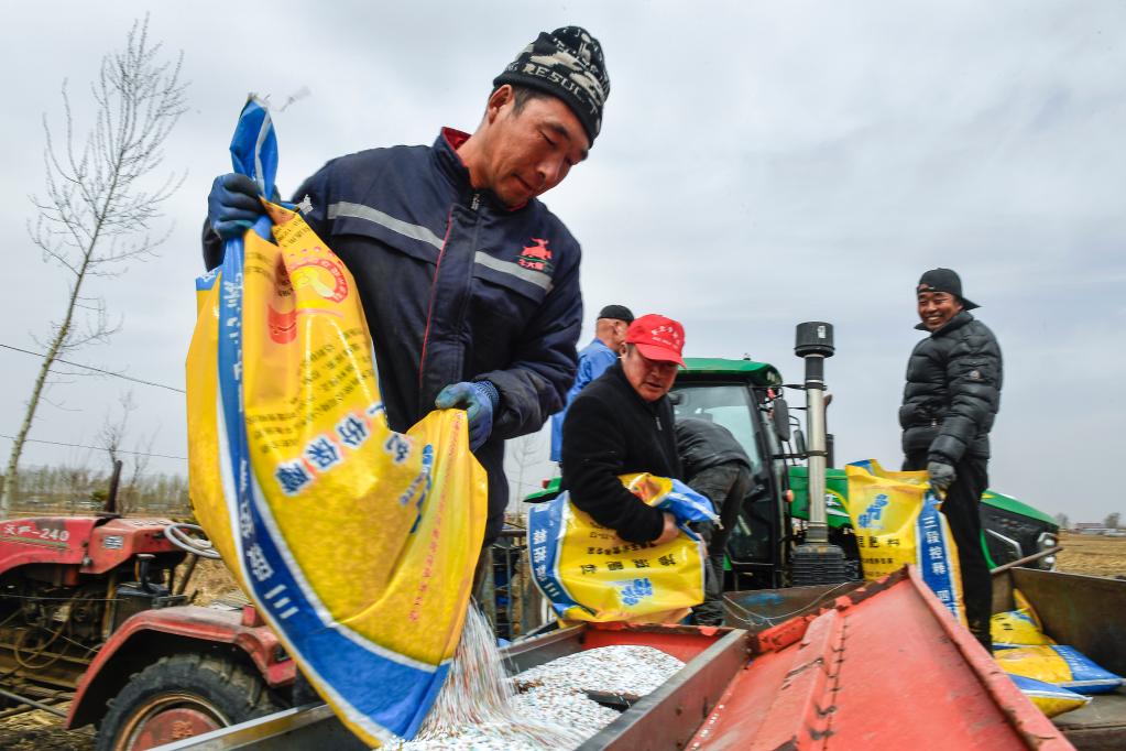 4月20日,在吉林省公主嶺市秦家屯鎮王家窩堡村,農民向農機中添加肥料。新華社記者 許暢 攝