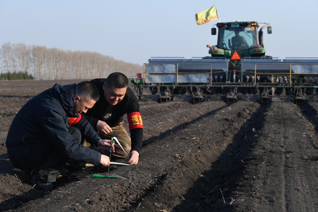 4月8日,在位于黑龍江省北安市的北大荒集團建設農場(chǎng)有限公司第四管理區一處農田,農業(yè)技術(shù)員在監測施肥作業(yè)質(zhì)量。新華社記者 王松 攝