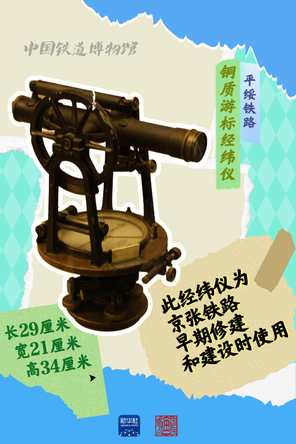 這件平綏鐵路使用的銅質(zhì)游標經(jīng)緯儀,為京張鐵路早期修建和建設時(shí)使用。該經(jīng)緯儀制作精良,在當時(shí)屬于具有較高科學(xué)技術(shù)水平的設備。2009年張家口車(chē)務(wù)段將其捐贈給中國鐵道博物館正陽(yáng)門(mén)展館。
