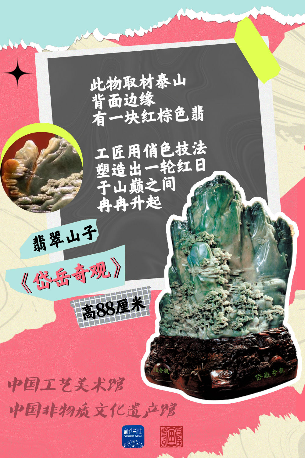 中國工藝美術(shù)館(中國非物質(zhì)文化遺產(chǎn)館)館藏的翡翠山子《岱岳奇觀(guān)》讓人嘆為觀(guān)止,它采用鏤雕、圓雕、深淺浮雕等工藝手法,體現層層疊疊的樹(shù)木、小橋。中景、遠景采用淺浮雕、陰刻等手法,使之深遠。作品背面用鐵線(xiàn)篆體字刻唐代詩(shī)人杜甫的《望岳》,填以金色,風(fēng)格古樸高雅,書(shū)法和工藝造型相映生輝。