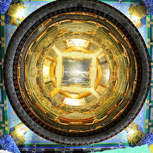 北京古代建筑博物館的鎮館之寶是這座美輪美奐的藻井,整個(gè)藻井的結構為方井內含圓井,圓井內又含方井。藻井四角立力士雕像,意在托起中心圓井。圓井應為六層框架,現存有五層,其中幾層之上布置有天上宮闕。宮闕里有精雕細琢的仙人天女,表情神態(tài)極為細膩。藻井的最上方是一幅星象圖,在燈光照射下宛若星河。