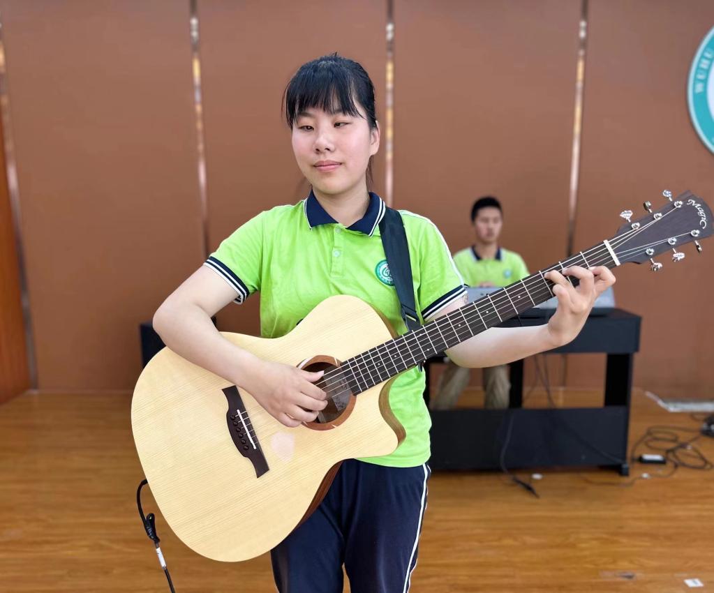 毛歡笑熟稔地撥弄著(zhù)琴弦,和著(zhù)音樂(lè )的節奏輕輕哼唱起來(lái)。這一刻,這個(gè)16歲的江蘇宿遷姑娘的角色是搖滾樂(lè )隊吉他手?!坝幸稽c(diǎn)緊張,但更多的是期待?!睂τ谧约旱奈枧_首秀,她已經(jīng)躍躍欲試。