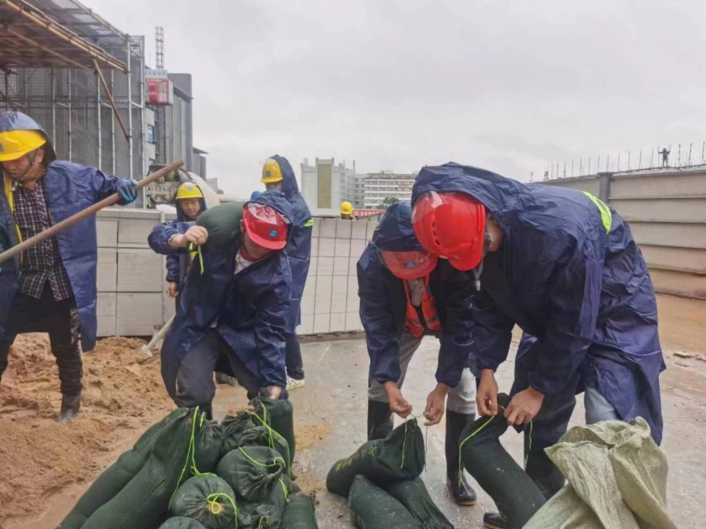 中建三局廣東省實(shí)驗中學(xué)永平校區項目建設現場(chǎng),施工人員在綁扎沙袋做好防汛準備。(程立波 攝)