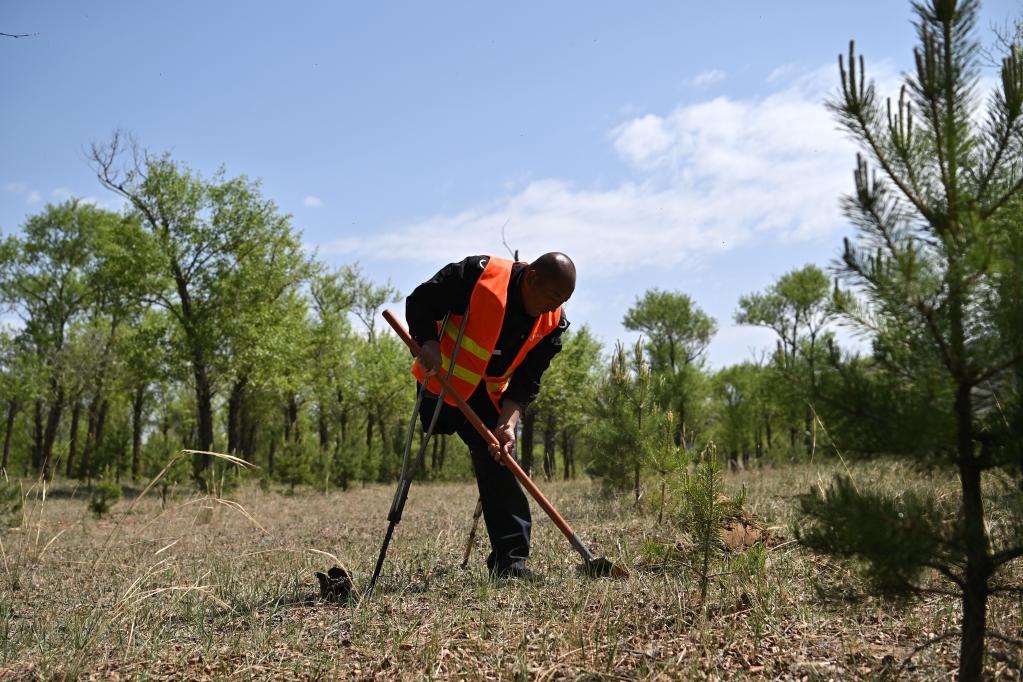 護林員馬裕在林場(chǎng)空地補種樹(shù)苗(5月18日攝)。新華社記者 詹彥 攝