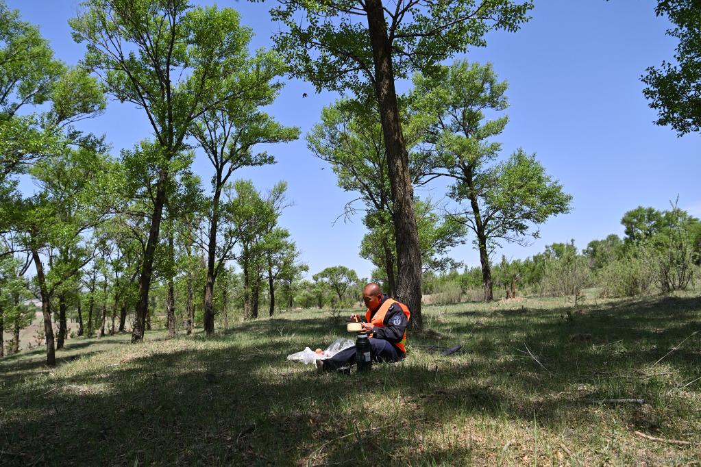 護林員馬裕在巡查途中吃午飯(5月18日攝)。新華社記者 詹彥 攝