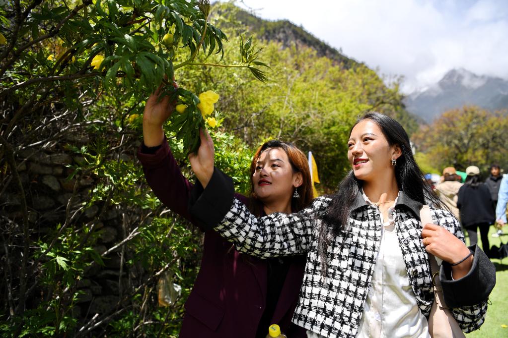 5月28日,兩名游客在米林市南伊珞巴民族鄉扎貢溝觀(guān)賞野生大花黃牡丹。新華社記者 張汝鋒 攝