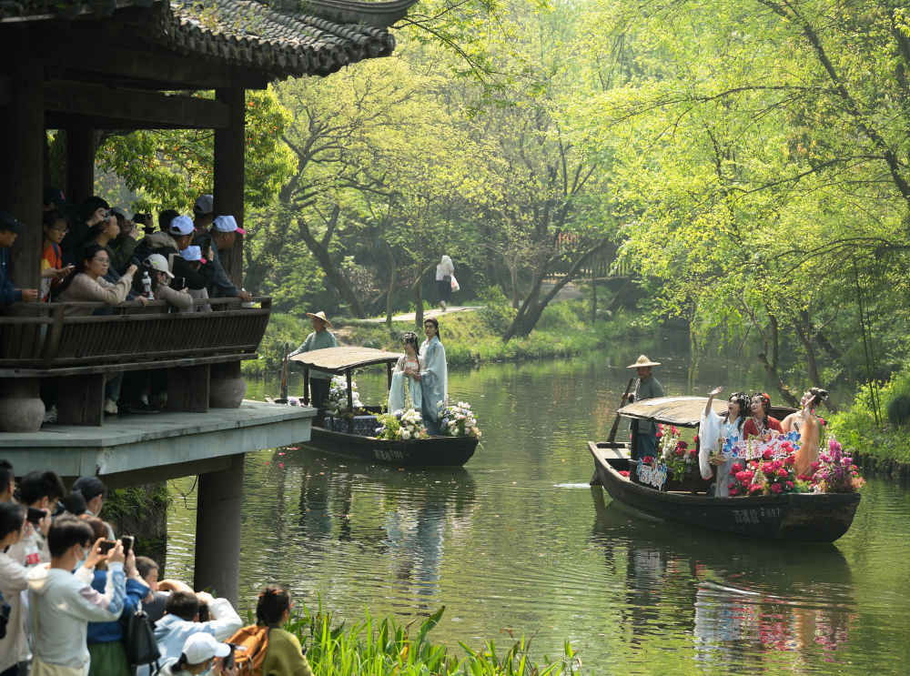 游客在杭州西溪濕地觀(guān)看宋韻花朝節游船巡游(2023年4月2日攝)。新華社記者 翁忻旸 攝