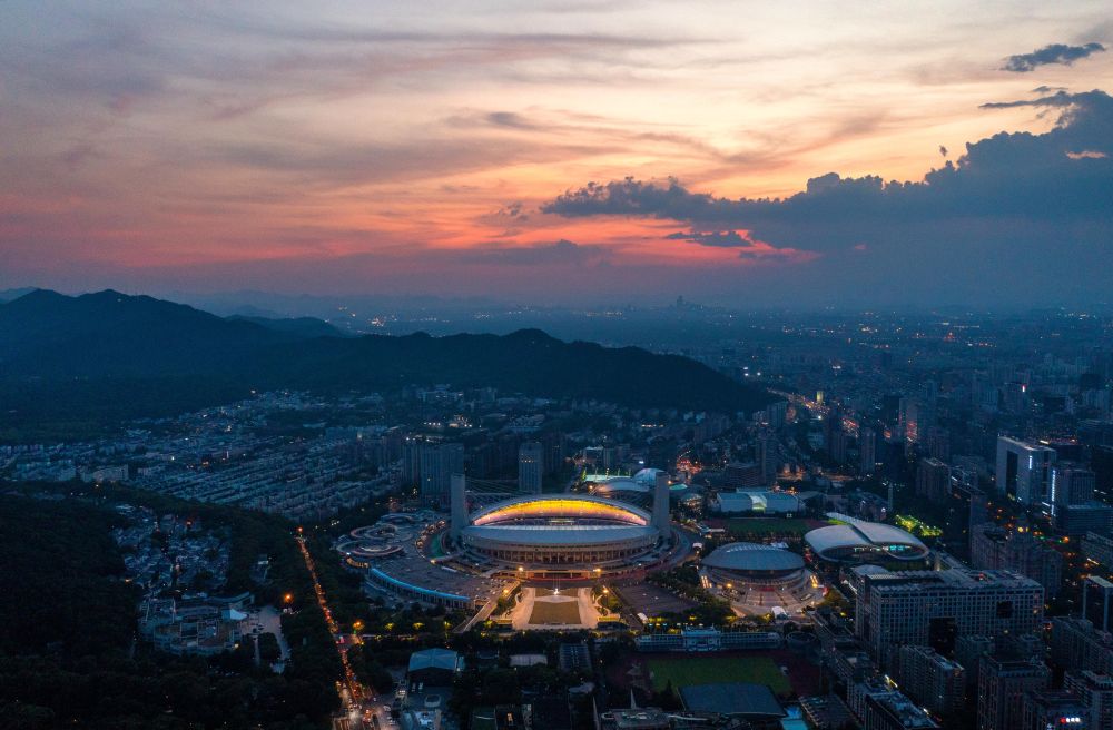 夜色中的杭州黃龍體育中心(2022年8月15日攝,無(wú)人機照片)。新華社記者 徐昱 攝