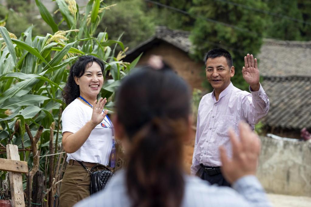 2021年6月23日,時(shí)任四川省涼山彝族自治州喜德縣光明鎮禁毒防艾專(zhuān)職副書(shū)記魯剛(右)和社區戒毒(康復)工作站專(zhuān)職社工阿加五呷(左)在看望一名社區戒毒康復人員后與她揮手道別。 新華社記者 沈伯韓 攝