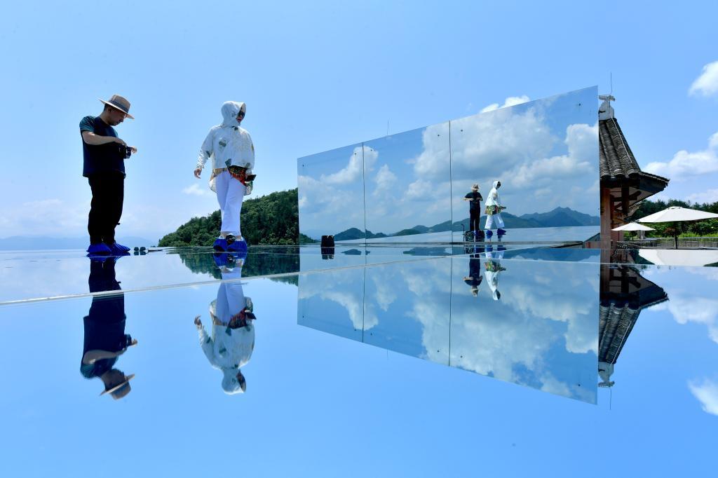 6月25日,游客在宣恩縣鑼圈巖村一處鄉村民宿的“天空之鏡”景點(diǎn)游玩。新華社發(fā)(宋文攝)