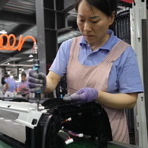 雞澤縣翼鑫塑料制品有限公司的工作人員在組裝空調外殼。(新華社記者趙鴻宇攝)