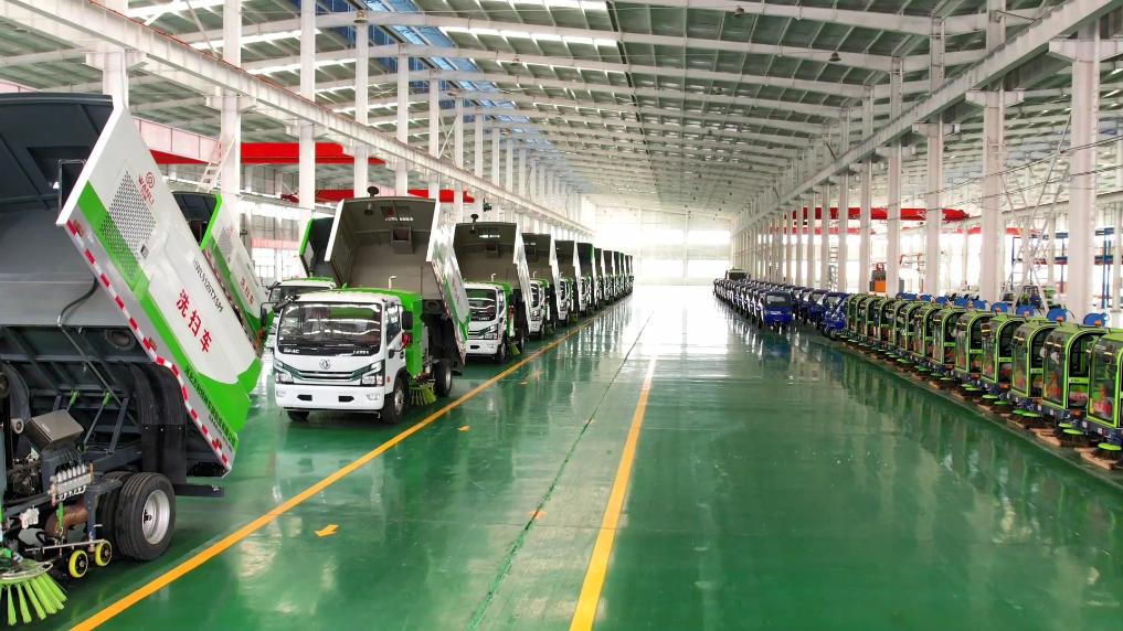 河北萬(wàn)利特種車(chē)輛制造有限公司生產(chǎn)車(chē)間等待出廠(chǎng)檢驗的清掃車(chē)。(新華社記者 趙鴻宇攝)