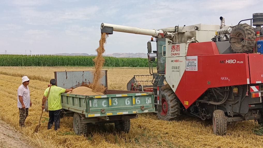烏拉特中旗烏加河鎮農戶(hù)正在收獲小麥。新華社記者 李云平 攝