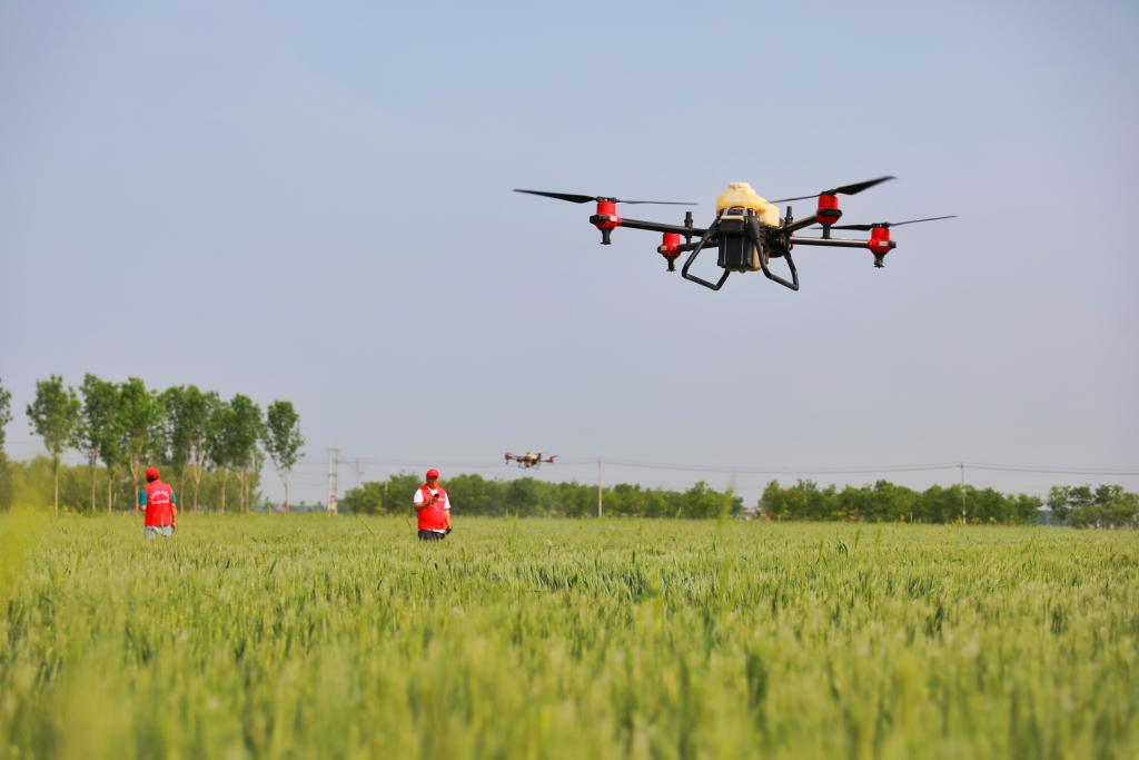5月10日,樂(lè )陵市農業(yè)社會(huì )化服務(wù)組織無(wú)人機操作手在托管麥田里進(jìn)行“一噴三防”作業(yè)。新華社記者賈云鵬 攝