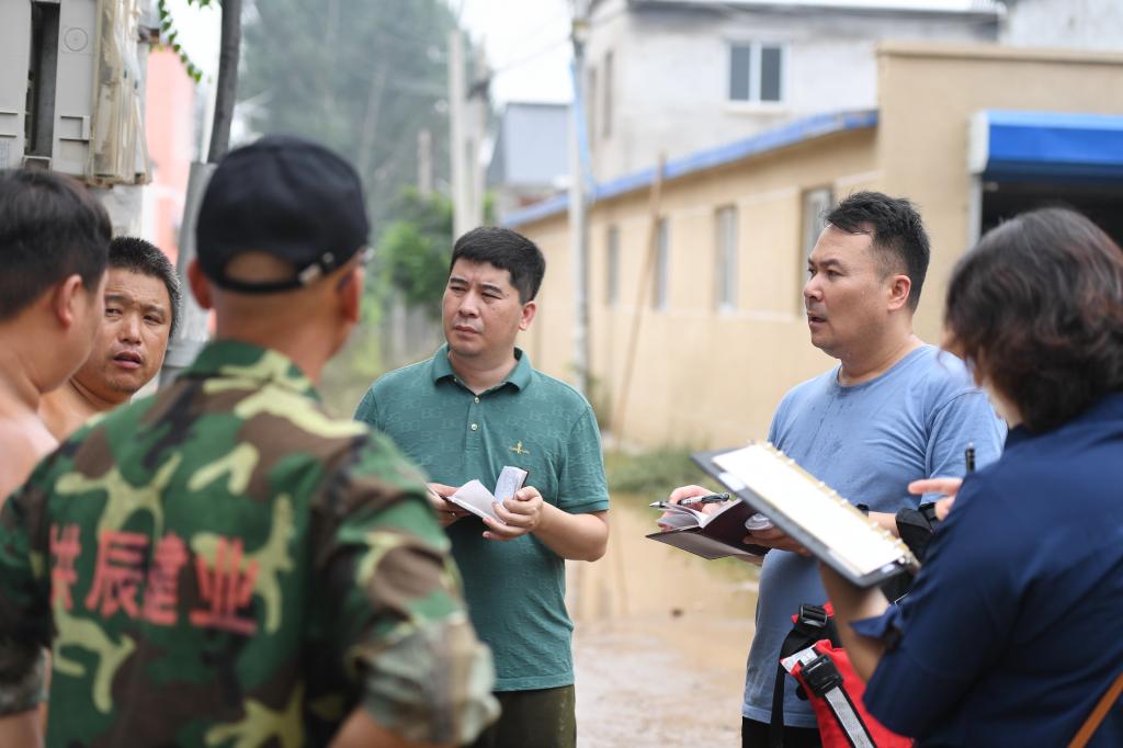 8月3日,新華社記者高博(右三)和同事在涿州市碼頭鎮北高莊村內采訪(fǎng)受災群眾。新華社記者 牟宇 攝