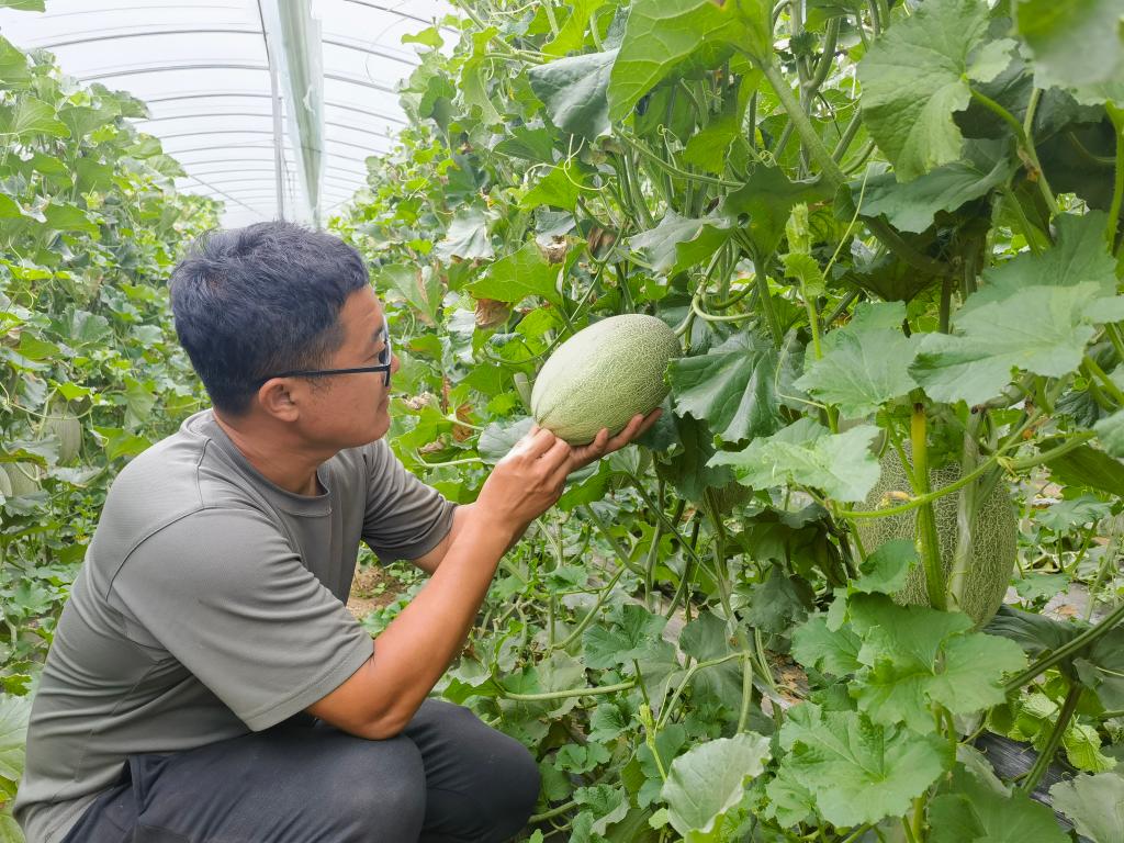 在濟南市章丘區高官寨街道的山東會(huì )園農業(yè)科技有限公司甜瓜大棚,馬振強查看網(wǎng)紋瓜長(cháng)勢。新華社記者王志 攝