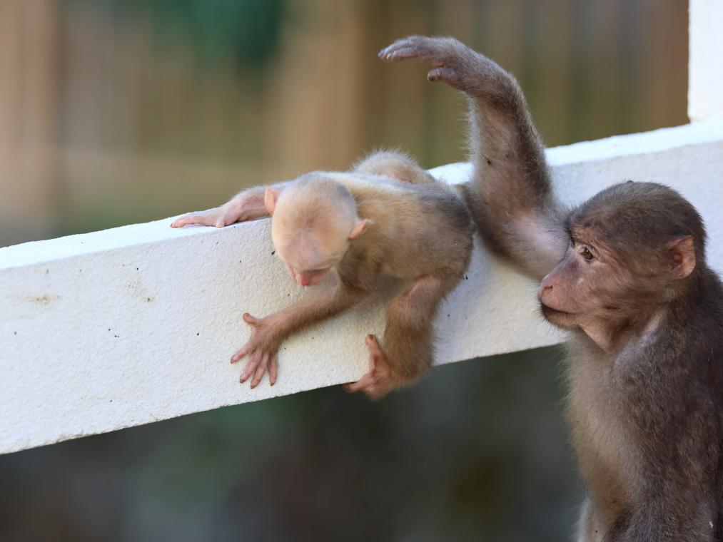 2022年7月23日,在武夷山國家公園腹地桐木村附近,藏酋猴在看護攀爬中的幼崽。新華社記者 姜克紅 攝