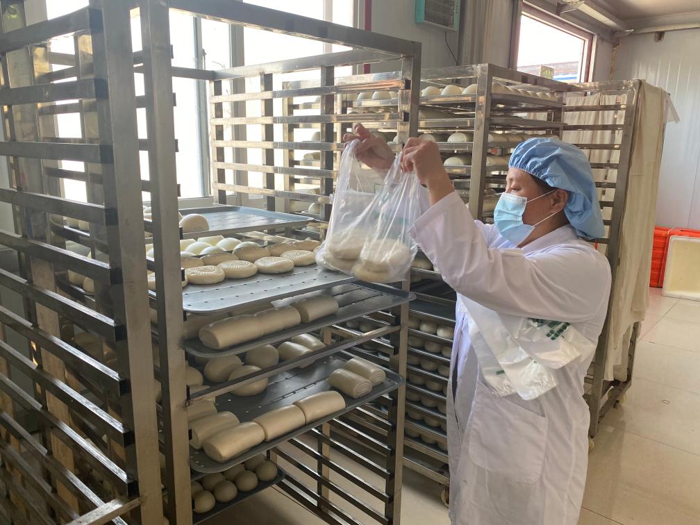 向村里走一小段,便能聞見(jiàn)面點(diǎn)的香氣,歇業(yè)了十幾天的龐嘴村饅頭坊如今水汽蒸騰。工人們正將蒸制完畢的饅頭等面點(diǎn)分裝打包,準備發(fā)往客戶(hù)手中。
