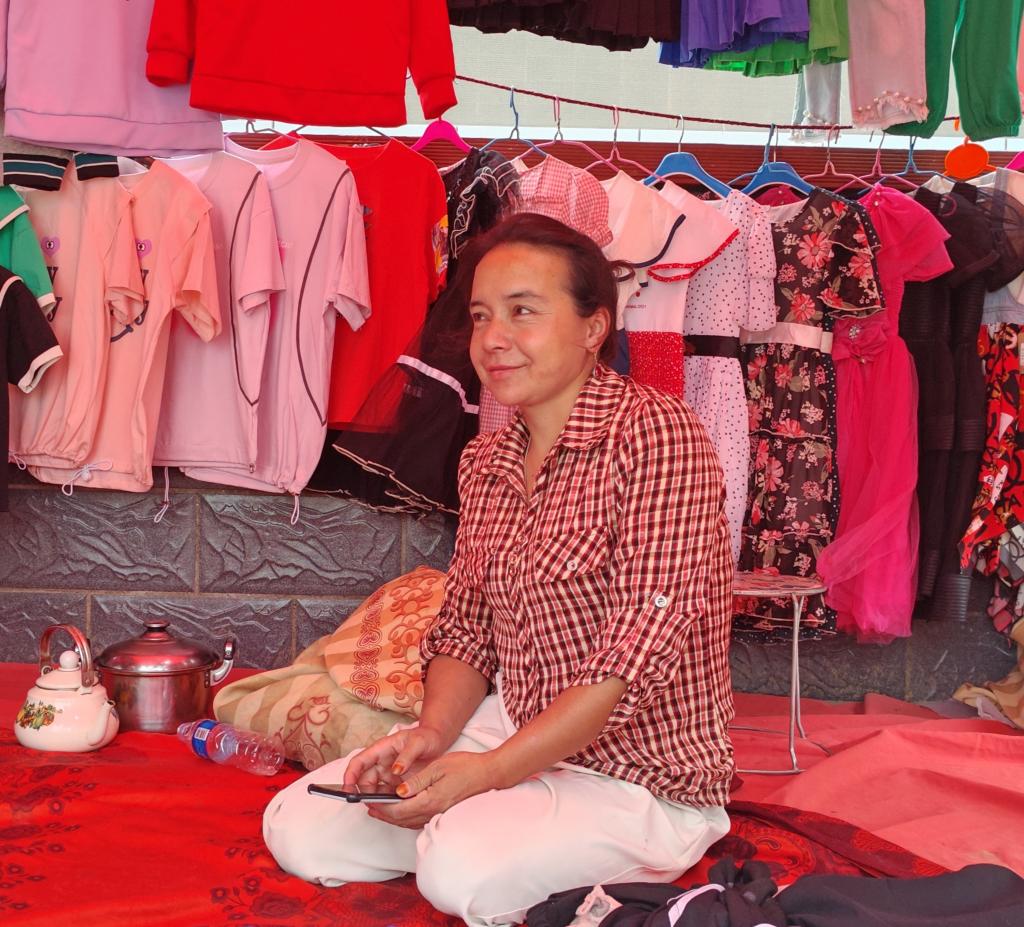 阿依米沙汗·買(mǎi)買(mǎi)提明在達里雅布依村擺攤賣(mài)衣服。(8月13日攝)新華社記者 茍立鋒 攝