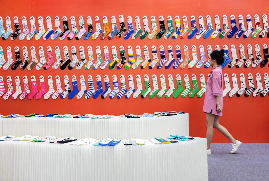 8月23日,一名女子在襪業(yè)博覽會(huì )上參觀(guān)。新華社發(fā)(郭斌攝)