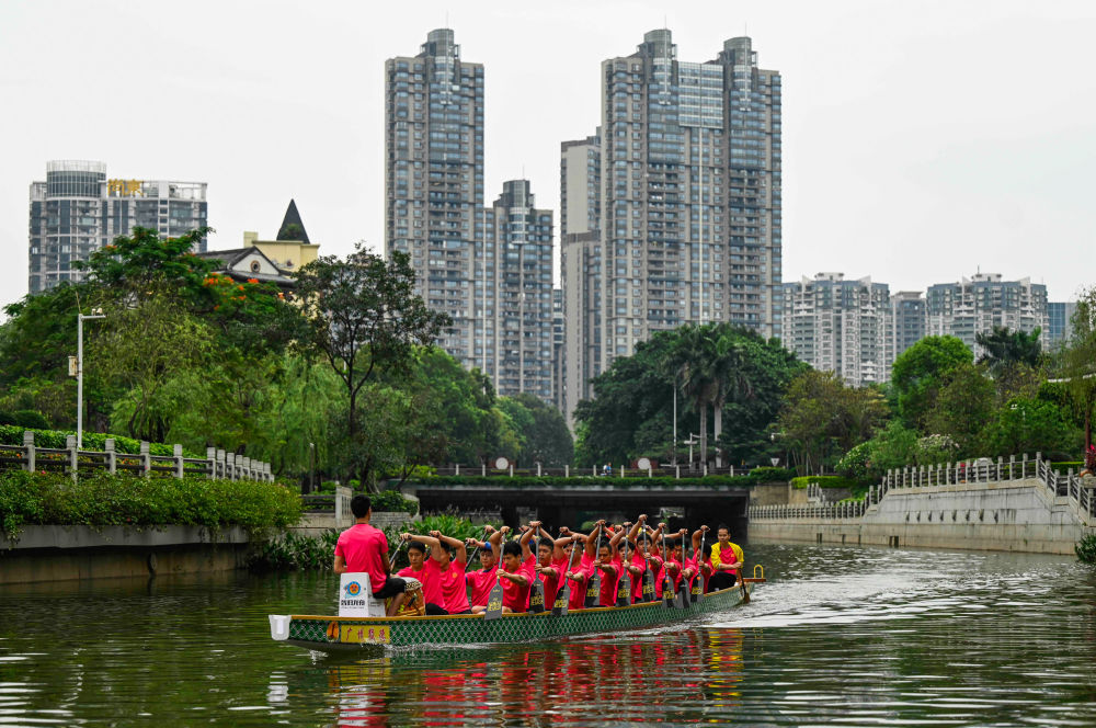 位于廣州CBD的獵德村村民進(jìn)行龍舟訓練,備戰端午龍舟賽(2023年5月8日攝)。新華社記者 劉大偉 攝