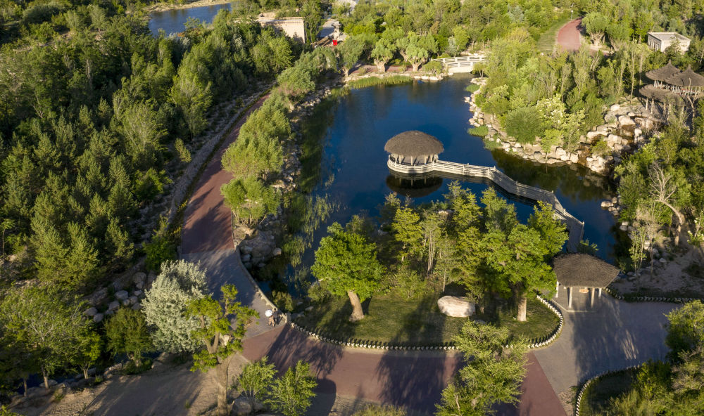 坐落在寧夏銀川市賀蘭山腳下的賀蘭山運動(dòng)休閑公園(2021年5月27日攝,無(wú)人機照片)。這里曾是一片砂石采礦塌陷區,當地通過(guò)植被景觀(guān)再造、水系建設、現代管網(wǎng)鋪建等手段,重新利用廢石、廢坑及各類(lèi)廢棄建筑材料,把這里變成一座免費開(kāi)放的主題公園。新華社記者 馮開(kāi)華 攝