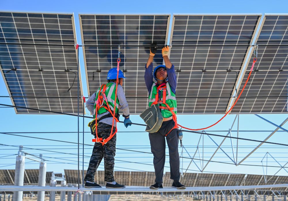 2023年7月22日,工人在位于內蒙古杭錦旗庫布其沙漠億利生態(tài)示范區的蒙西基地庫布其200萬(wàn)千瓦光伏治沙項目工地安裝光伏板。新華社記者 劉磊 攝
