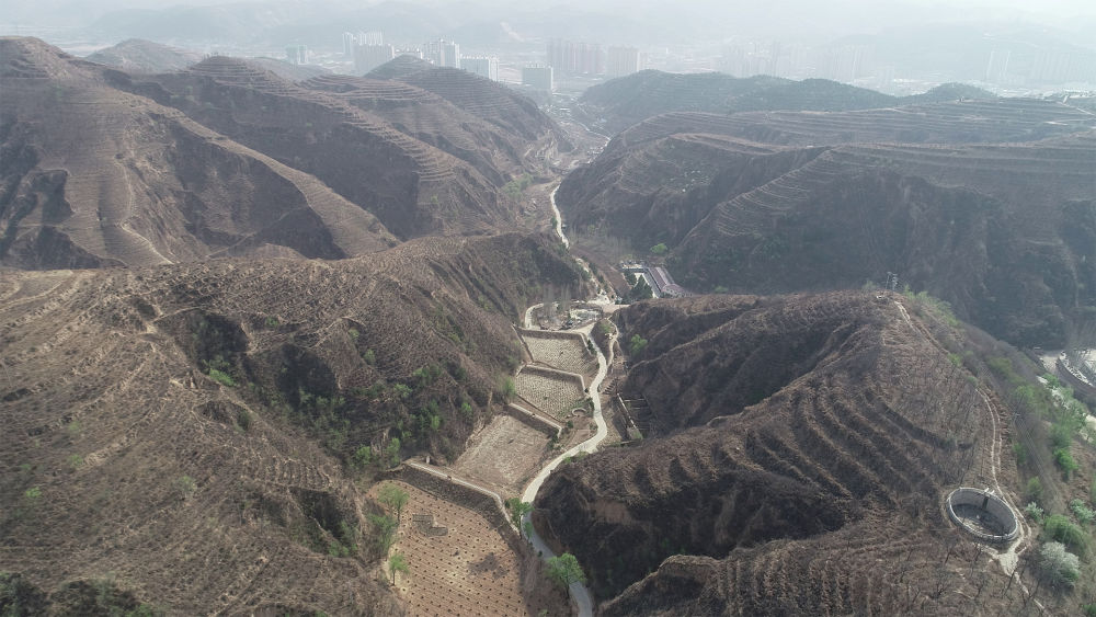 這是2019年4月18日無(wú)人機拍攝的陜西綏德水土保持科學(xué)試驗站淤地壩建設成果(視頻截圖)。新華社記者 張晟 攝