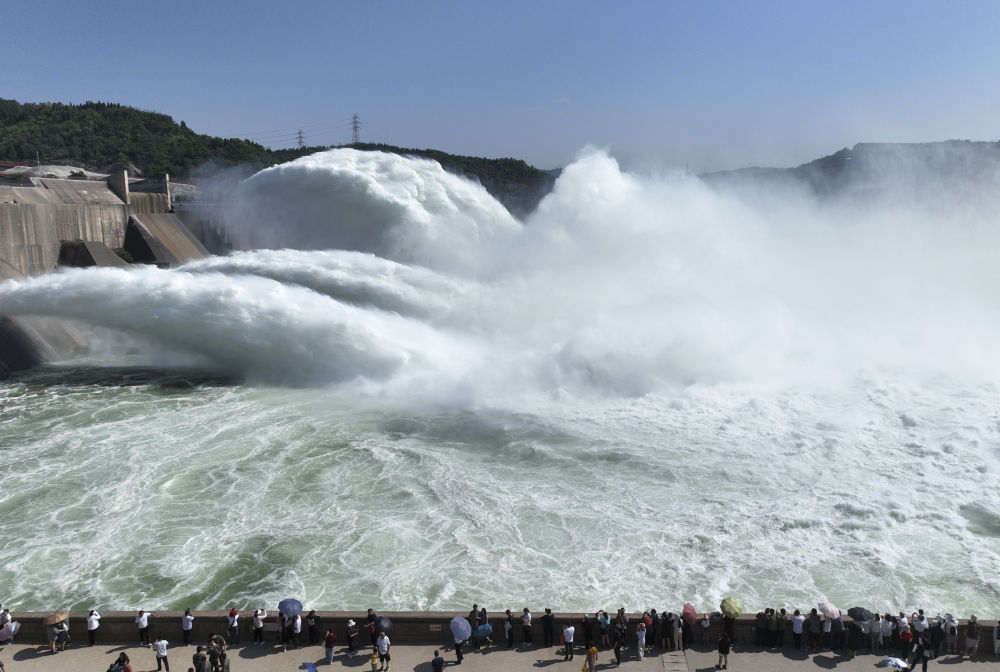 2023年6月23日,游客在黃河小浪底水利樞紐工程出水口觀(guān)看調水調沙(無(wú)人機照片)。新華社發(fā)(苗秋鬧 攝)