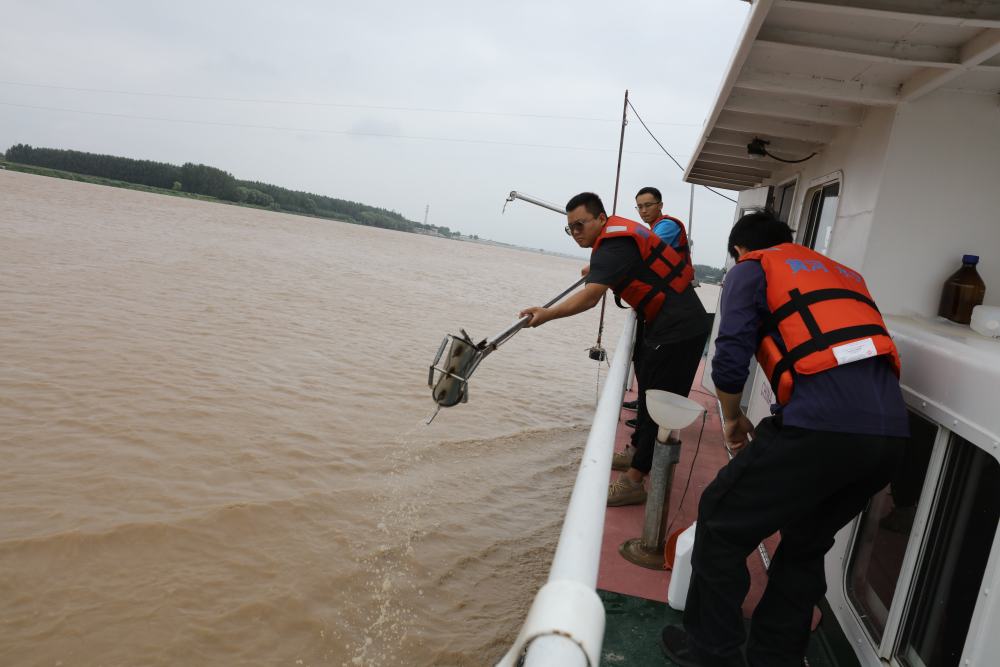 2023年6月29日,調水調沙期間,黃河下游利津水文站工作人員在進(jìn)行取沙作業(yè)。新華社記者 劉詩(shī)平 攝