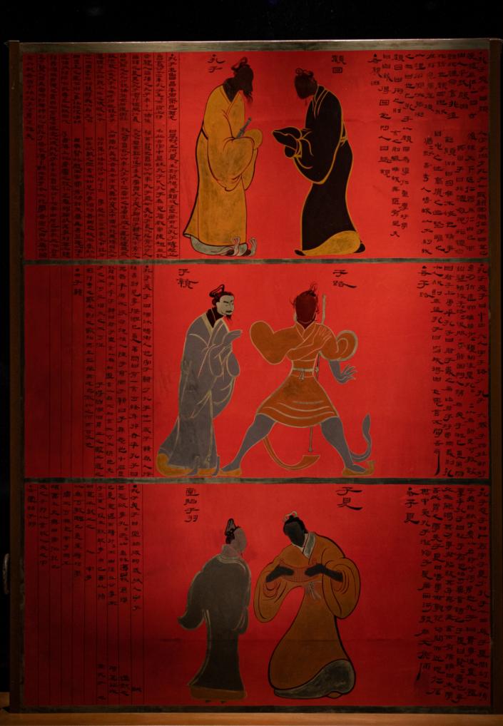 圖為南昌漢代?;韬顕z址博物館中展出的孔子徒人圖漆衣鏡復制品。左上人物為孔子。南昌漢代?;韬顕z址博物館提供