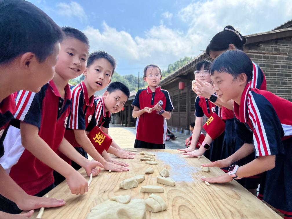江西永新縣曲白鄉白沙村大井岡研學(xué)基地里小游客們正在體驗勞動(dòng)實(shí)踐。(劉昕哲 攝)
